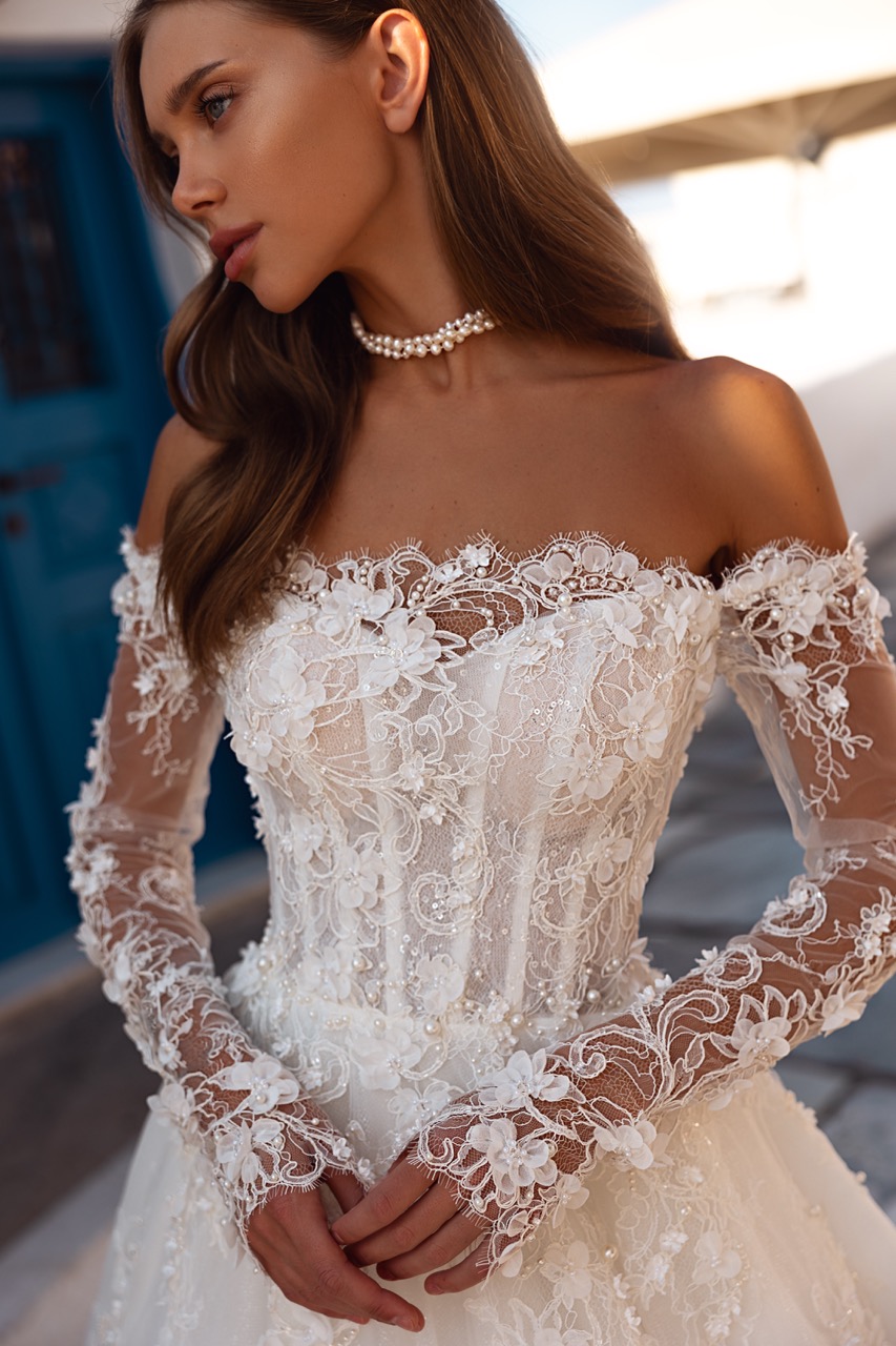 A poetic fusion of romance and delicacy, this gown features a sheer corset bodice adorned with hand-appliquéd florals and shimmering beadwork. The off-the-shoulder sleeves add a dreamy touch, perfect for a bride who wants to bloom with grace.